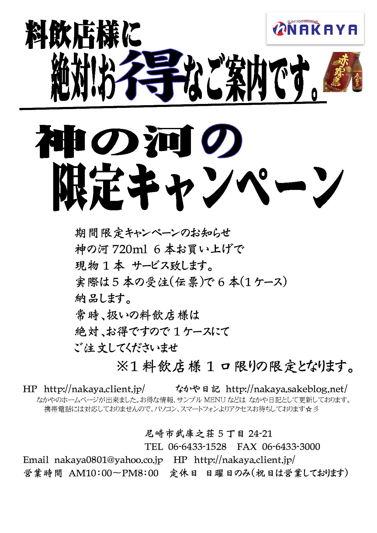 兵庫県尼崎武庫之荘酒屋 なかや酒店 店主の日常。尼崎市・伊丹市・西宮宝塚・塚口・立花業務用酒類販売。樽生・瓶ビール激安販売! 神の河ブラック・吉四六・三岳、常時取り扱い店。 地域への贈答・御祝・敏速対応!配達敏速・バラ1本より配達します。 近隣の飲食店のお得情報・開店情報・こまめにUPします!!